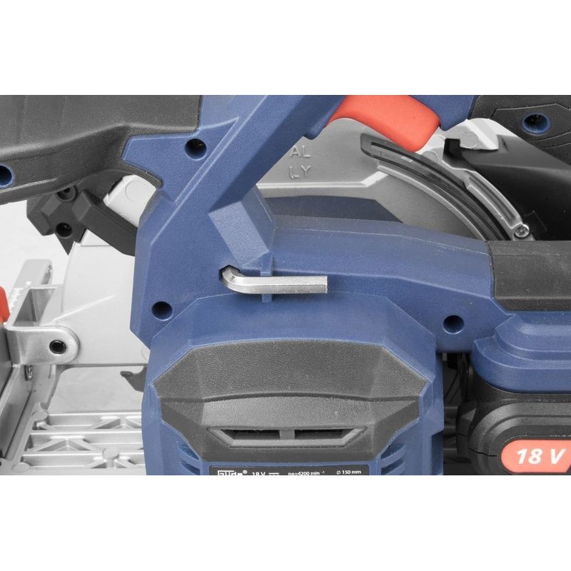 Akumulátorová okružná píla zo série akumulátorového náradia 18V e3 na rezanie panelov, drevotrieskových dosák a drevných materiálov. Silný vysoko výkonný motor. Horčíkový ochranný kryt. Laser na presné pozdĺžne rezy. Rýchla, jednoduchá výmena pílového kotúča. Maximálna hĺbka rezu 48 mm pri 90°. Pogumovaná rukoväť pre bezpečnú prácu. Pílový kotúč 150×1,6×10 24Z HM, paralelný doraz. Aretácia vretena, rýchlo stop, ukazovateľ stavu nabitia batérie. Bez batérie a nabíjačky.