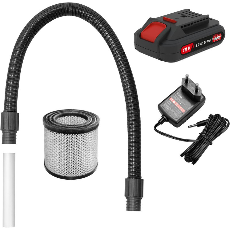 Akumulátorový vysávač na popol zo série akumulátorového náradia 18V E3 na použitie okolo domu a v záhrade. 15-litrová nádoba, 1 meter dlhá nasávacia hadica, hliníková nasávacia rúrka, HEPA filter na jemný prach. Vrátane akumulátora 2,0 Ah a nabíjačky.