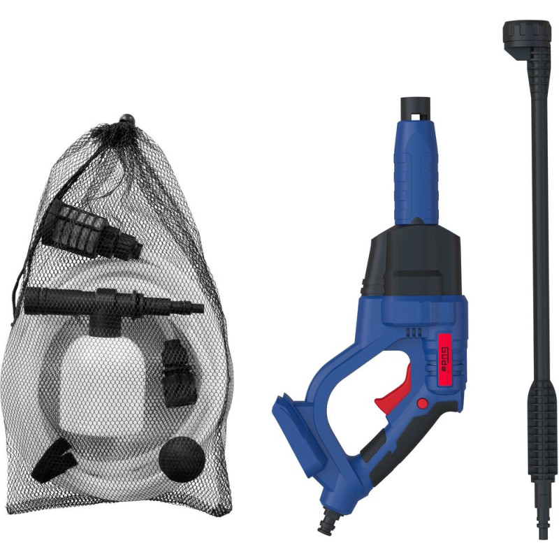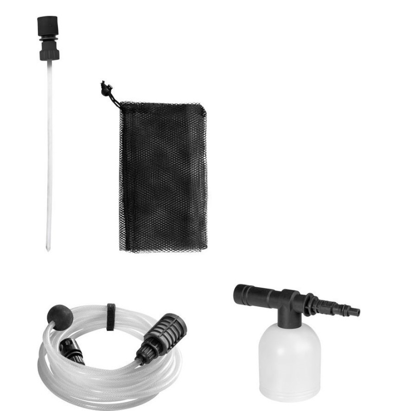 Akumulátorový tlakový čistič zo série akumulátorového náradia 18V E3. Multifunkčná dýza so šiestimi rôznymi funkciami, bezpečnostný spínač zabraňuje neúmyselnému zapnutiu, mäkké držadlo. Samonasávacia funkcia na používanie vody napríklad z cisterny, rybníka alebo z nádoby na dažďovú vodu. Pripojenie rýchlospojkou. Filtračný kôš na nasávacej hadici. Fľaša na čistiaci prostriedok, tlaková hadica 6 m, multifunkčná dýza, vak na uskladnenie, adaptér na pripojenie PET fliaš. Bez akumulátora a nabíjačky (akumulátor a nabíjačka zo série Easy-Energy-Exchange sú k dispozícii samostatne).