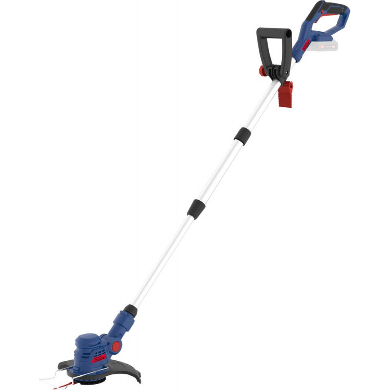 Akumulátorový vyžínač so systémom batérie 18V E³. Dvojité nože pre efektívnu prácu, trimovacia hlava otočná o 180° a sklopná do 5 polôh, teleskopická rukoväť, prídavná rukoväť, uloženie náhradných nožov v prídavnej rukoväti, strmeň pre ochranu rastlín, Softgrip rukoväť. Vrátane 20 náhradných nožov. Bez batérie a nabíjačky.