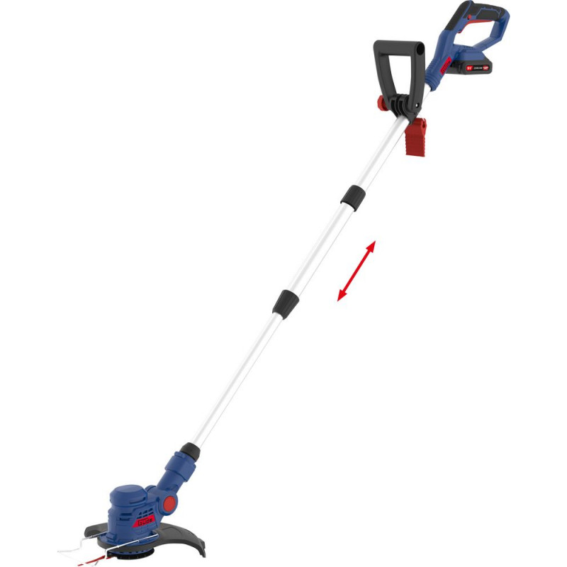 Akumulátorový vyžínač so systémom batérie 18V E³. Dvojité nože pre efektívnu prácu, trimovacia hlava otočná o 180° a sklopná do 5 polôh, teleskopická rukoväť, prídavná rukoväť, uloženie náhradných nožov v prídavnej rukoväti, strmeň pre ochranu rastlín, Softgrip rukoväť. Vrátane 20 náhradných nožov, batérie 2,0 Ah a nabíjačky 0,5 A.