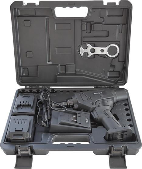 Rozsah dodávky: Akumulátorové zariadenie na osadzovanie nitovacích matíc GO-SN1, 2 lítiovo-iónové rýchlovýmenné akumulátory 18 V/2,0 Ah, rýchlonabíjačka 18 V, 4 závitové tŕne M5, M6, M8, M10 , 4 nadstavce M5, M6, M8, M10, v kufri ABS.