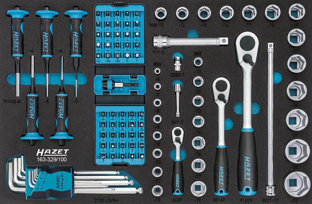 Vyhotovenie: Stabilná konštrukcia z oceľového plechu, so 7 jednostranne vysúvacími zásuvkami (5 × 80; 2 × 165 mm vysoké), s valčekovým vedením, stredovou a koncovou poistkou, ako aj individuálnou poistkou proti neúmyselnému otvoreniu počas pohybu. Základné vybavenie zahŕňa jednu priehradku na každú zásuvku. Bočné steny majú štvorhranné otvory. Centrálne uzamykateľný pomocou cylindrického zámku. Pracovná doska z plastu odolného voči rozpúšťadlám, s priehradkami pre malé diely. S veľkými, ťažkými kolieskami s guľôčkovými ložiskami (Ø 125 mm), 2 vodiacimi kolieskami, s brzdou (totálne zastavenie) na pevné postavenie vo všetkých smeroch. Všetky kolieska sú vybavené ochranou pred vláknami, ktorá chráni ložiská pred nečistotami a vláknami. Práškovo lakovaný povrch odolný proti poškriabaniu, korpus v modrej farbe Hazet, zásuvky čierne.