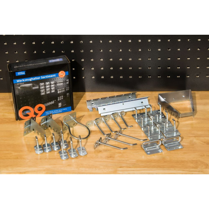 Držiaky nástrojov a háčiky v súprave sú vhodné na uchytenie do perforovanej steny a systémov so štvorcovými otvormi 10 x 10 mm, stredovou vzdialenosťou otvorov 38 mm vertikálne a horizontálne.