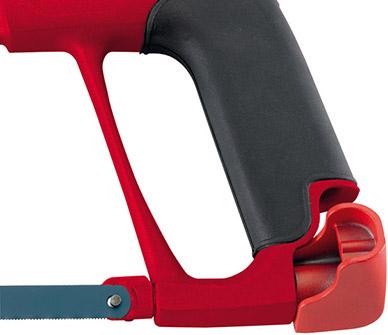Vyhotovenie: Stabilný strmeň z hliníkovej tlakovej liatiny, s epoxidovou práškovou povrchovou úpravou, rukoväť a predná rukoväť pogumované na dobré uchopenie, s čelnou ochranou proti skĺznutiu. Napnutie listu v pištoli pomocou otočnej hlavy. Dodávka vrátane bimetalového pílového listu, 24 zubov na palec.