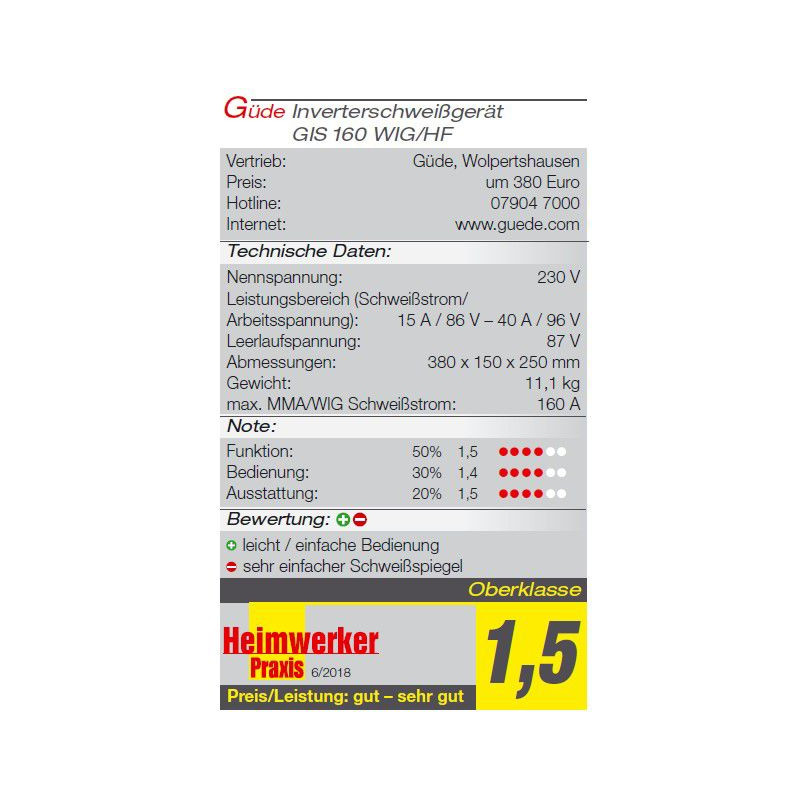 Invertorová zváračka na príležitostné, malé až stredné zváracie práce. Nízka hmotnosť, popruh na prenášanie. Vďaka zariadeniu WIG-HF a príslušnému plynu, ako aj vhodnému regulátoru tlaku je zváračka vhodná na zváranie inertným plynom. V procese WIG vybavená volfrámovou ihlou na okamžité použitie. Vďaka automatickému vysokofrekvenčnému zapaľovaniu ponúka zvárací invertor optimálny zvárací komfort vo všetkých polohách zvárania. Oblúk sa vytvára v správnej vzdialenosti od obrobku jednoduchým stlačením tlačidla a umožňuje tak veľmi jednoduchý a efektívny proces zvárania. Invertor je možné použiť aj na zváranie všetkými bežnými elektródami do priemeru 4,0 mm s výkonom až 160 A. Vlastnosti ako ARC-FORCE na stabilizáciu oblúka, HOT START pre ľahké zapálenie elektródy prostredníctvom zvýšeného napätia a vysokej frekvencie a v neposlednom rade ANTI STICK, ktorý zabraňuje nepríjemnému prilepeniu a žíhaniu elektródy, zaisťujú špičkové výsledky aj pre neskúsených zváračov. Kladivko na strusku s kefkou, držiak elektródy s káblom (konektorové pripojenie 9 mm), uzemňovacia svorka s káblom (konektorové pripojenie 9 mm), tepelná ochrana. Zváracie zariadenie WIG s bezkontaktným vysokofrekvenčným zapaľovaním (2 keramické trysky, 1 volfrámová ihla 1,6 mm; 1 volfrámová ihla 2,4 mm; 2 klieštiny (1,6 mm/2,4 mm), 2 držiaky trysiek (1,6 mm/2,4 mm), 2 upínacie skrutky (1,6 mm/2,4 mm).