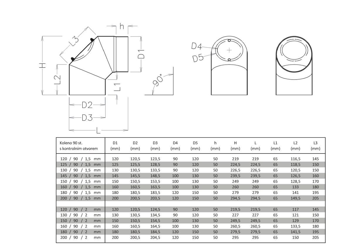 Koleno 90° s čistiacim otvorom, hrubostenná dymovina, hrúbka materiálu 1,5/2mm.