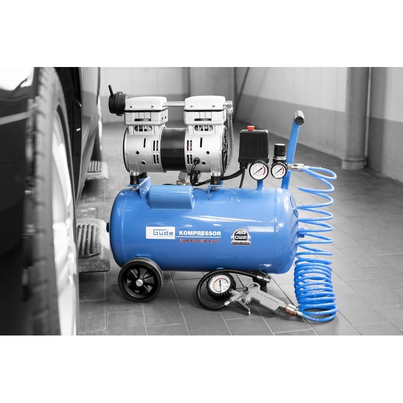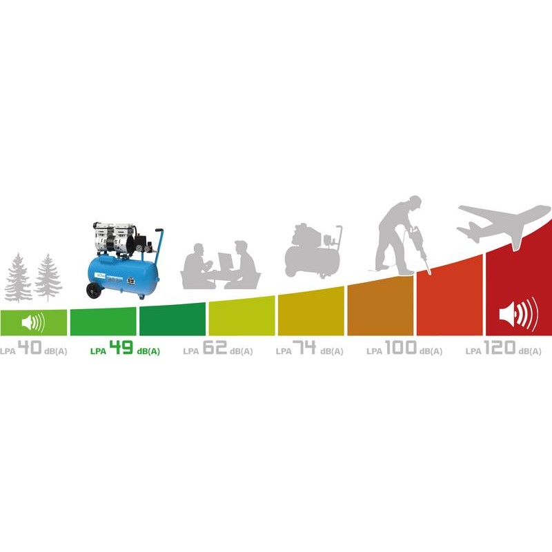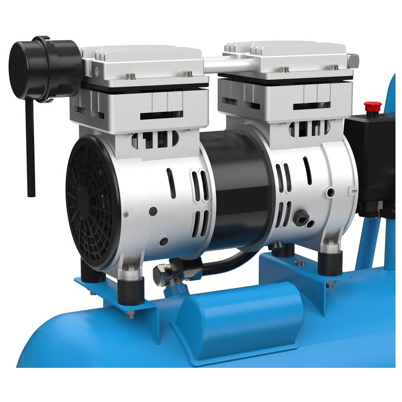 Bezolejový dvojvalcový piestový kompresor, dvojpiestový agregát s priamym pohonom. Mechanický tlakový spínač, manometer na meranie tlaku v nádobe a pracovného tlaku, 24-litrová nádrž s gumovými tlmičmi, rukoväť na prenášanie. Tichý chod. Jedna pneumatická spojka, bezpečnostný ventil a vypúšťacia skrutka na kondenzát.