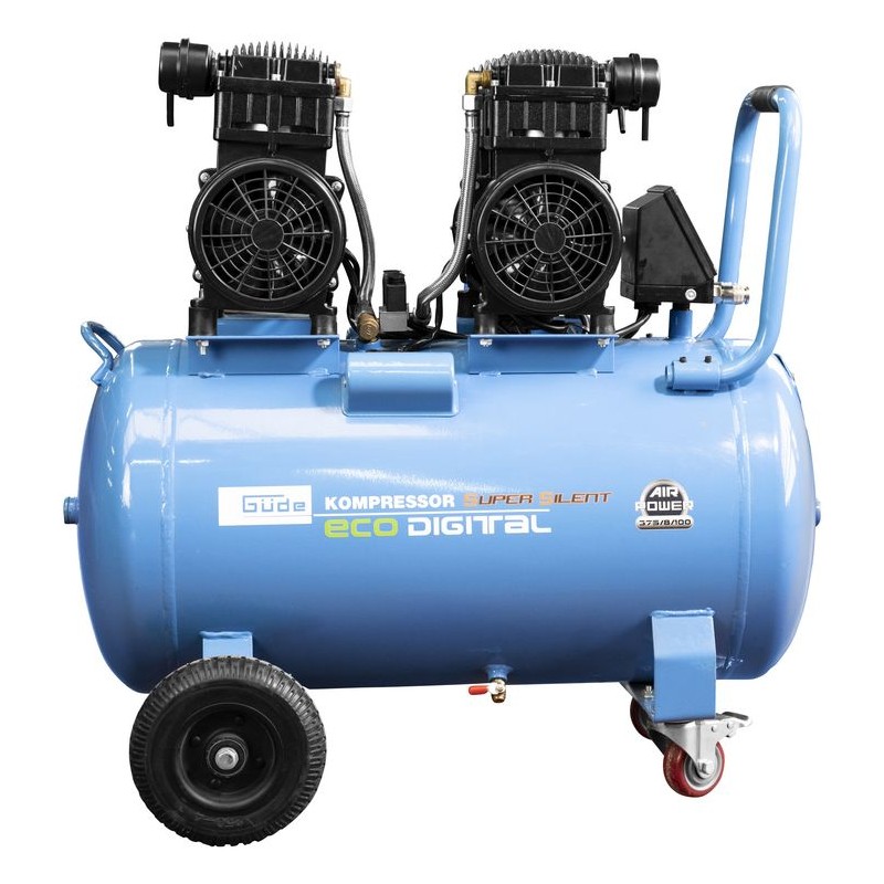 Bezolejový štvorvalcový piestový kompresor, 2 dvojpiestové agregáty so samostatným motorom, 4 vzduchové filtre, 2 prepínacie relé pre oneskorený štart. Digitálny tlakový spínač s časomeračom, digitálne nastaviteľný riadiaci a odpájací tlak, 100-litrová nádrž. Rukoväť na prenášanie a riadiace kolieska. Tichý chod. Dve pneumatická spojky, bezpečnostný ventil a vypúšťacia skrutka na kondenzát.