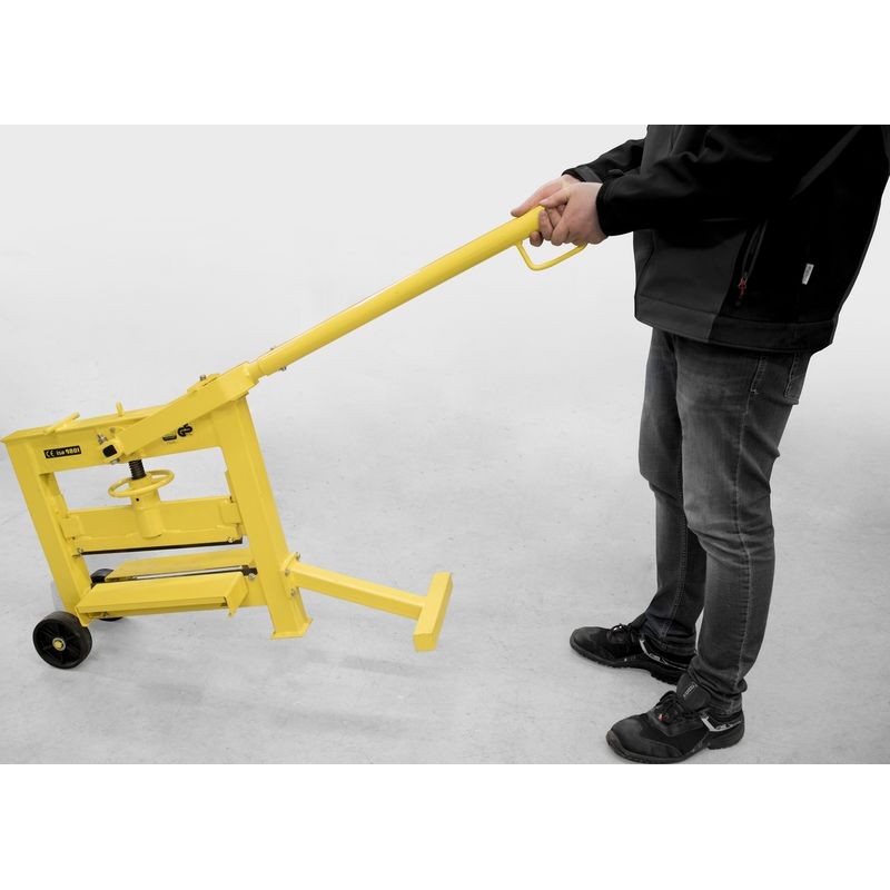 Lámačka kameň s odpruženými podperami, jednoduché nastavenie výšky štiepania cez centrálne závitové vreteno, potrebná menšia sila vďaka teleskopickej násade, podvozok pre jednoduchý presun, výmenný nôž s troma čepeľami. Na lámanie kameňa, dosák, obrubníkov.