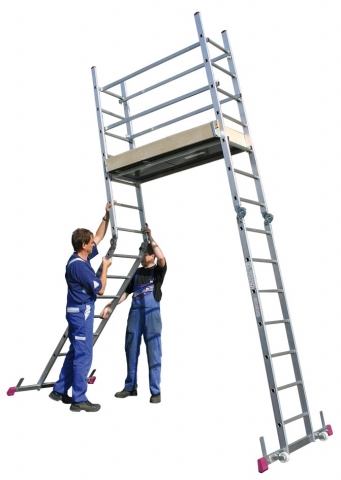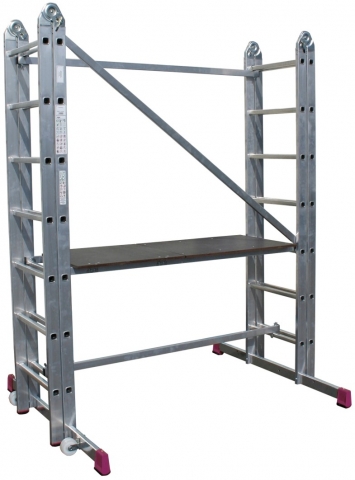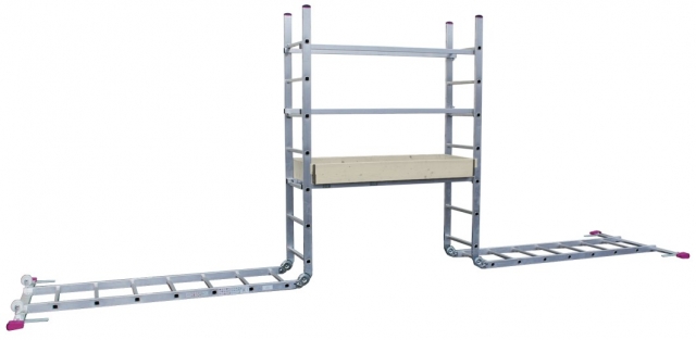 - Lešenie sa skladá z dvoch kĺbových rebríkoch, podesty, 2ks koliesok, zábradlia a výstuhy