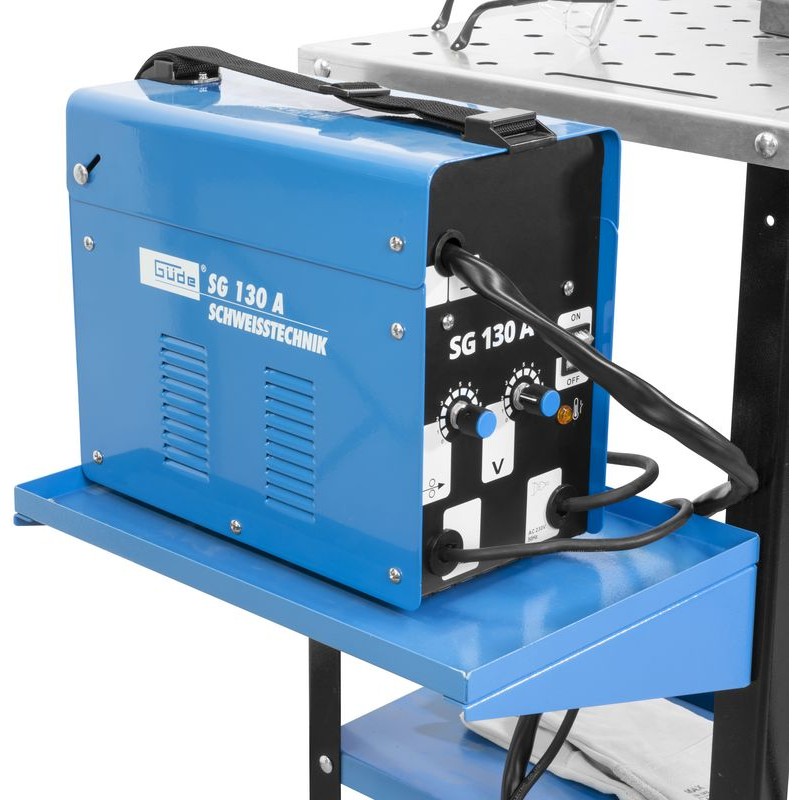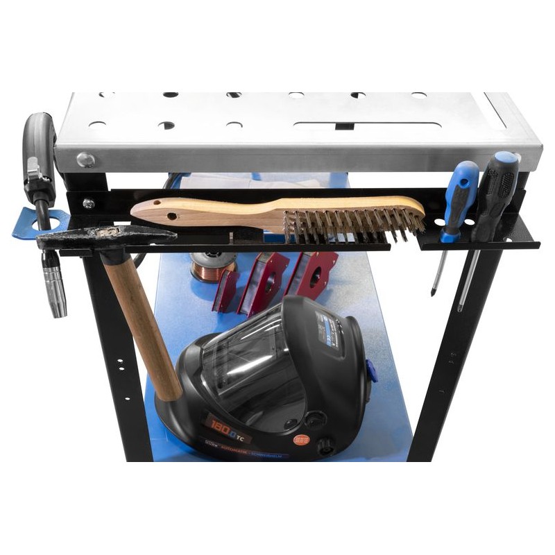 Pozinkovaný stôl na zváranie na použitie v dielni a garáži. Pevný, laserom vyrezávaný povrch stola s otvormi na zváracie svorky pre bezpečné upevnenie zvarového kovu. S pozdĺžnymi otvormi na upevnenie zverákov a uhlových svoriek. Maximálnu pohyblivosť a absolútnu stabilitu zabezpečujú 4 otočné kolieska so zaisťovacou brzdou. S konzolou zváracieho stola a držiakom elektród alebo držiakom horáka, ako aj lištou na náradie pre bezpečné uloženie všetkých dôležitých dielov. Priestranná odkladacia priehradka pod stolom ponúka dostatok miesta na dôležité príslušenstvo a zabezpečuje poriadok a prehľadnosť. Štvordielna súprava magnetov na zváranie umožňuje bezpečné polohovanie a upevnenie pri spájaní zvarového kovu.