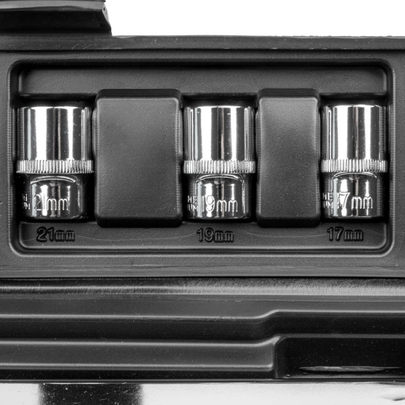 Súprava momentového kľúča, 3 nástrčkových kľúčov a predĺženia 125 mm. Guľôčková poistka na nástrčkové kľúče a predĺženie. Nástrčkové kľúče vo veľkostiach 17, 19 a 21 mm z chróm-vanádiovej ocele. Prepínacia páka na otáčanie doprava a doľava. Analógový displej na nastavenie krútiaceho momentu s dvojitou odčítateľnou stupnicou v Nm a Mkg. Automatický akustický signál po dosiahnutí krútiaceho momentu. Praktický box na prenášanie s otvorom na zavesenie.