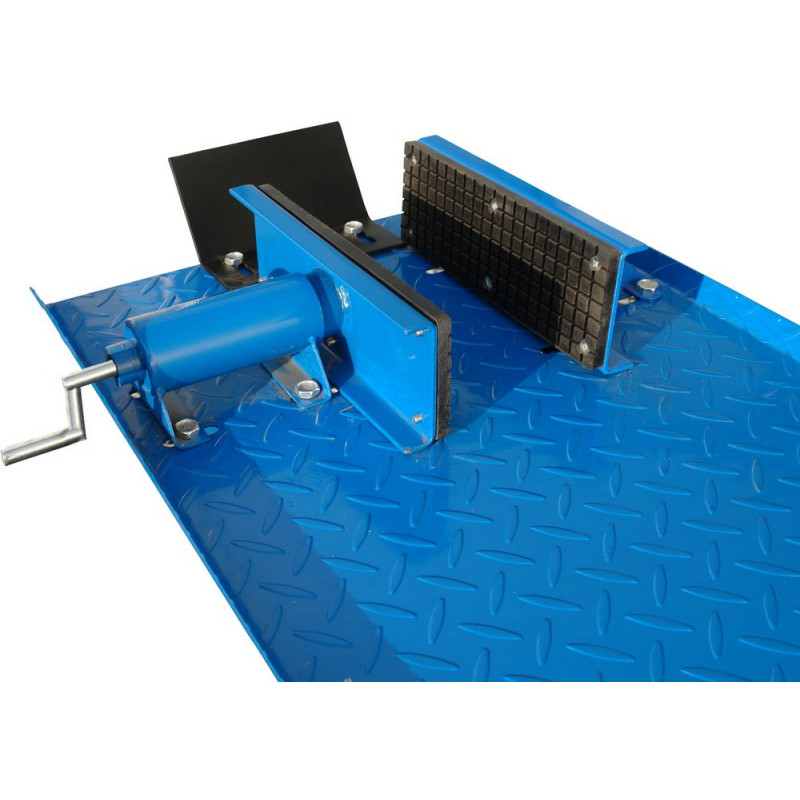 Zdvíhacia plošina na motorky do 360 kg. Celooceľová konštrukcia, 2 otočné a 2 pevné kolieska, podstavec zo štvorhranu, plošina z oceľového ryhovaného plechu, pohodlné zdvíhanie a spúšťanie pomocou nožného pedálu. Upevňovacie čeľuste na predné koleso do 135 mm, upevnenie prostredníctvom ručnej kľuky.