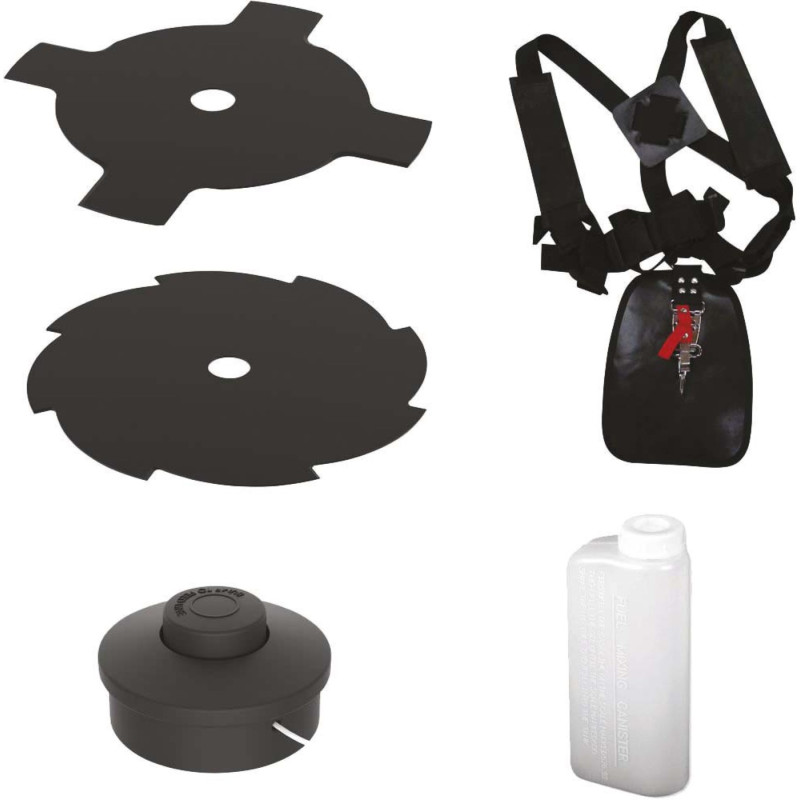 Príslušenstvo: Žacia hlava, 2x žací nôž, dvojramenný popruh, nádoba na miešanie paliva, sada náradia.