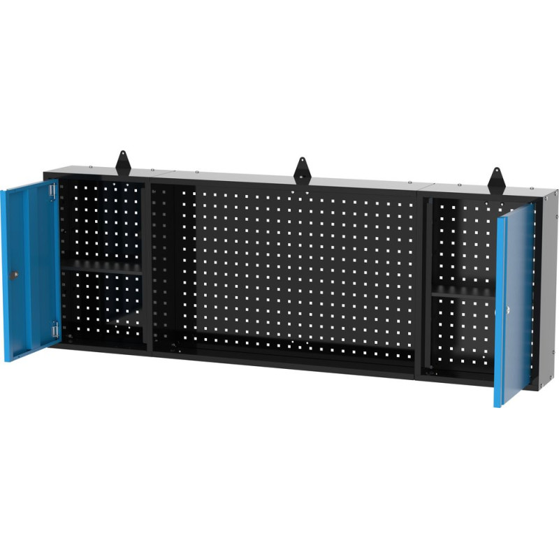 Dvojdverová závesná skrinka s prakticky integrovaným perforovaným panelom je dokonalým doplnkom radu Güde Eco-Line, s ktorým sa teraz dá optimálne využiť priestor na stene nad dvoma pracovnými stolmi XL od výrobcu GÜDE. Dve výškovo nastaviteľné police, štandardizovaná perforácia 9 x 9 mm, rozstup otvorov 38 mm. Oceľový plech s práškovou povrchovou úpravou. Dodáva sa v nezmontovanom stave.