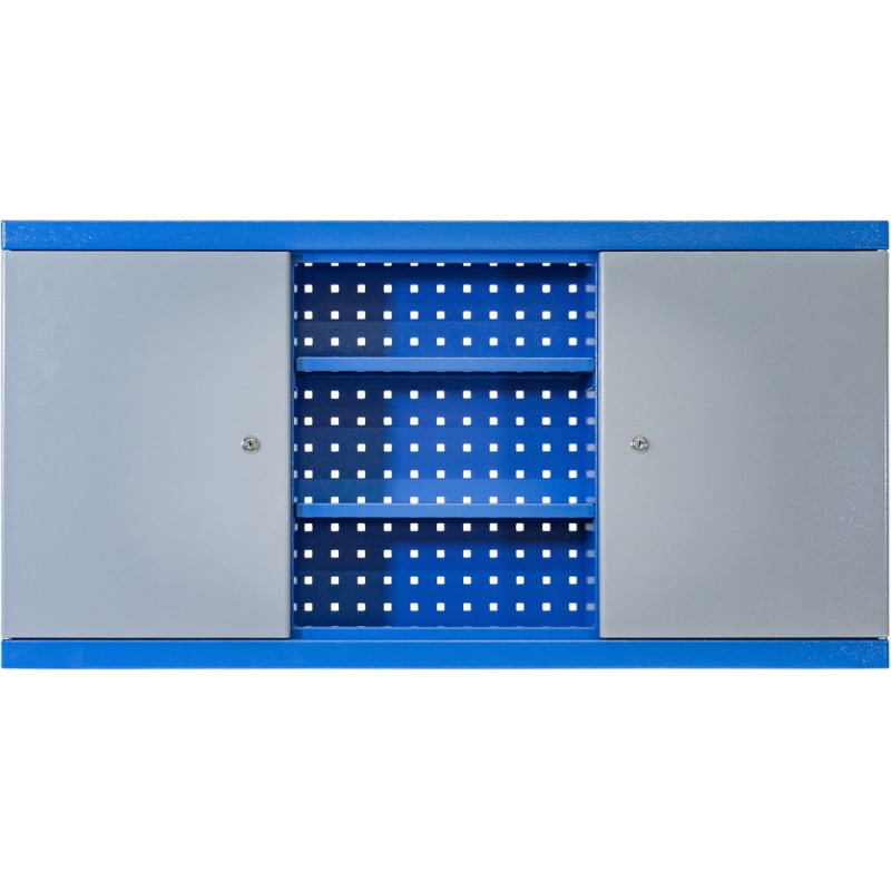 Skrinka do dielne so strednou časťou otvorenou, s dvomi vyberateľnými policami a s uzamykateľnými dvierkami na oboch stranách (cylindrický zámok vrátane 2 kľúčov). Celá konštrukcia z ocele upravená práškovou farbou, dizajn so zaoblenými hranami. Vnútro dvierok potiahnuté perforovaným plechom, po 2 vyberateľné police. Zadná stena skrinky z perforovaného plechu s dodatočnými výstužami. Perforované plechy so štvorcovou perforáciou 10 mm, vzdialenosť medzi otvormi 38 mm.