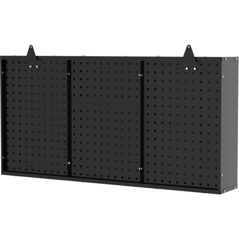 Trojdverová závesná skrinka s praktickou perforovanou zadnou stenou pre dostatok úložného priestoru v každej dielni. Celá konštrukcia z oceľového plechu upravená práškovou farbou. Zadná stena z perforovaného plechu, 3 police, 3 samostatne uzamykateľné dvierka. Perforovaný plech so štandardnou štvorcovou perforáciou 9×9 mm, vzdialenosť medzi otvormi 38 mm. Dodáva sa v demonte.