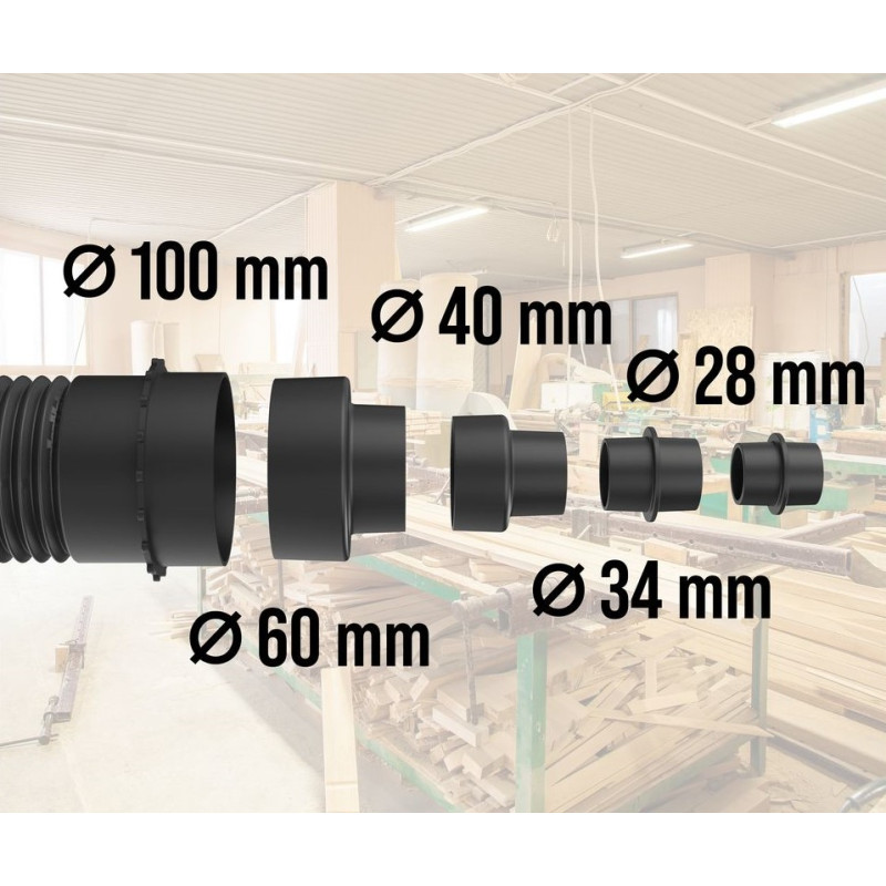 Odsávací systém pre drevoobrábacie stroje s pripojením na odsávanie pre hobby využitie, skladaný filter, jemné prachové rúno, papierové filtre, dĺžka hadice 2 m, vrátane adaptéra na všetky bežné prípojky (100/60/40/34/28 mm).