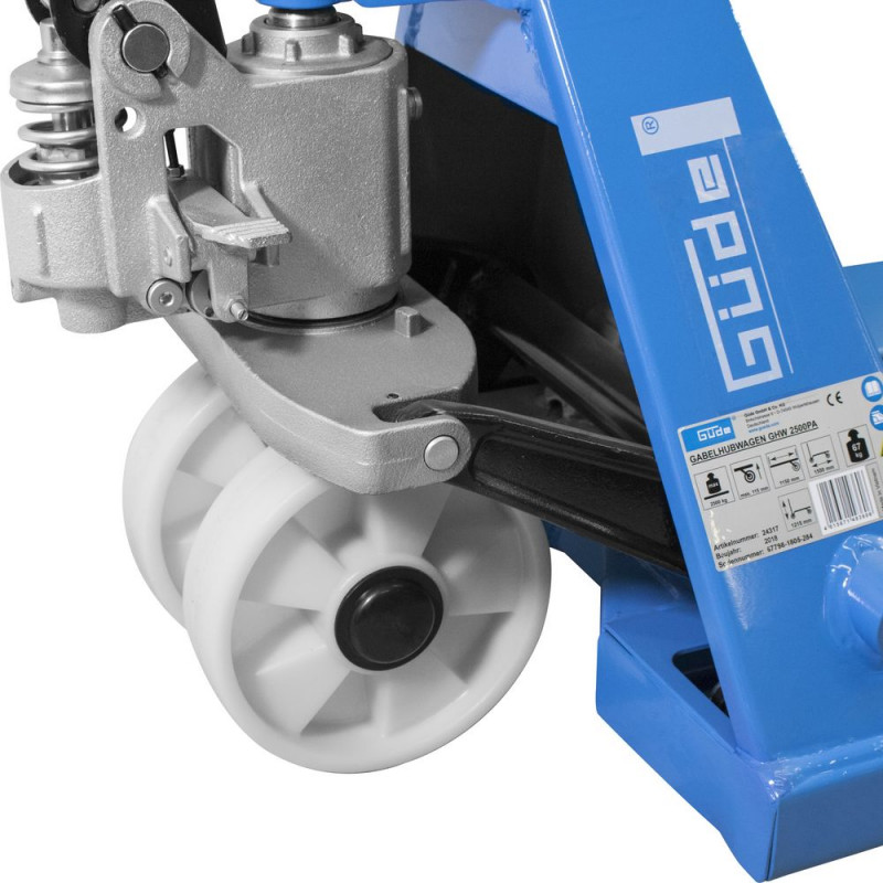 Paletový vozík pomáha pri preprave nákladov v sklade alebo v dielni. Jeho stabilná zostava s oceľovou konštrukciou odolnou voči skrúteniu a stĺpikom riadenia otočným o 180° zaisťuje malý polomer otáčania. Nosnosť paletového vozíka je 2500 kg. Funkcia zdvíhania sa vykonáva pomocou oja s ovládaním ventilu. Funkciu spustenia je možné vyvolať na rukoväti a dodatočne na integrovanom nožnom pedáli. Polyamidové kolieska, pomocné nábehové valčeky na naloženie palety zboku.