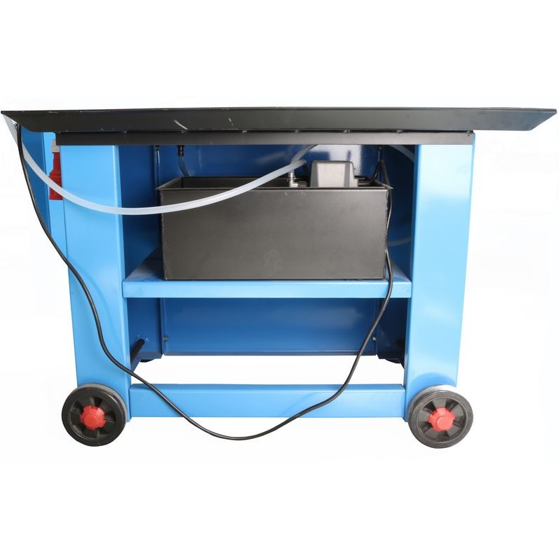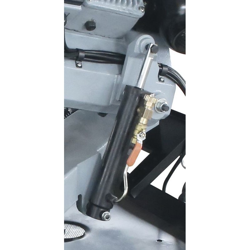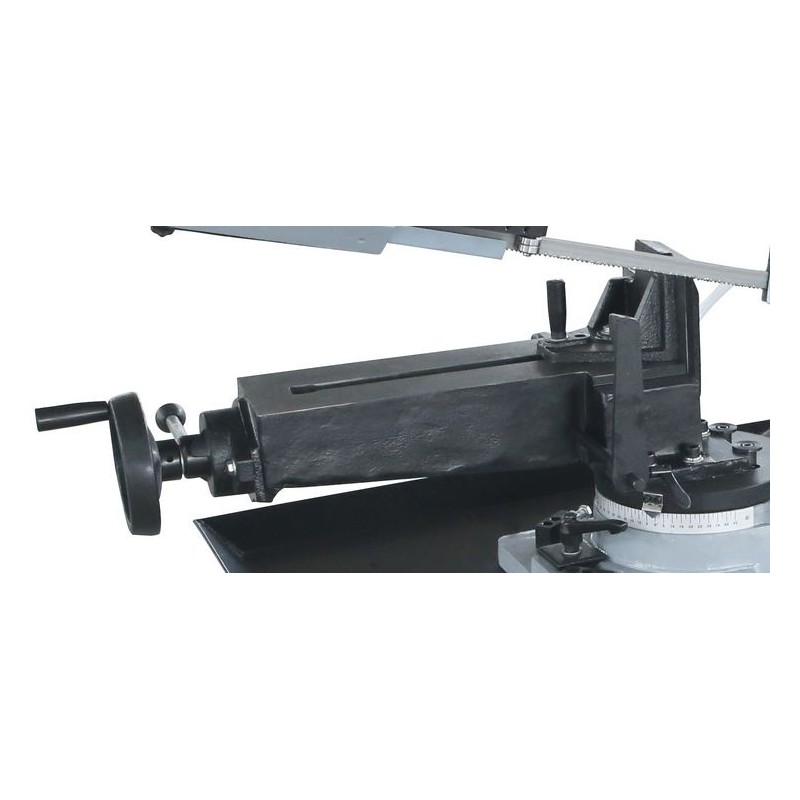 Pásová píla na kov s konštrukciou z liatiny. 10-násobné vedenie pílového pásu s guľôčkovými ložiskami. Rýchloupínací zverák s excentrickým upínacím systémom, zarážka obrobku, bimetalový pílový pás. Chladiace zariadenie, automatický koncový vypínač. Kefka na piliny. Otočný rám píly.