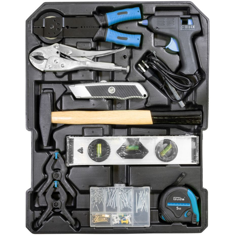V sade sa nachádza základné náradie z chróm-vanádiovej ocele do každej domácnosti či dielne, upevňovacie svorky, kladivo 300 g, trapézový orezávací nôž, krimpovacie kliešte, univerzálne škripcové kliešte, meracie pásmo 5 m, termolepiaca pištoľ, vodováha, izolačná páska, káblové viazače, rôzne klince a skrutky.