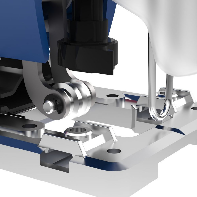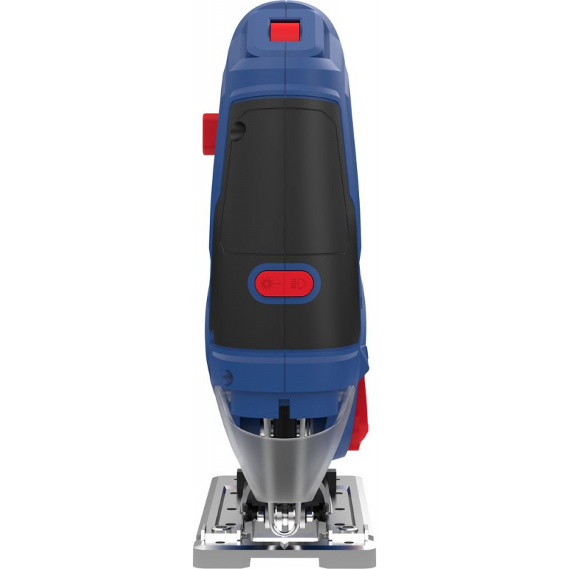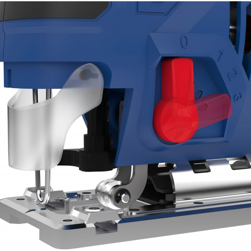 Priamočiara píla s laserom, s plynulou reguláciou otáčok, so systémom rýchlej výmeny pílového listu bez použitia náradia. Ergonomicky tvarovaná rukoväť s mäkkým úchopom, aretačný vypínač pre nepretržitú prevádzku. Prestaviteľná základňa do 45° na precízne šikmé rezy, 4-stupňový kyvadlový zdvih (3 + 0) pre najlepší rezný výkon. Prípojka na externý odsávací systém pre bezprašnú prácu. Indikátor línie rezu, LED pracovné svetlo. Hliníková základňa, priehľadná ochrana pílového listu, svorka na paralelný doraz. Vrátane pílového listu na rezanie dreva, imbusový kľúč, paralelný doraz.