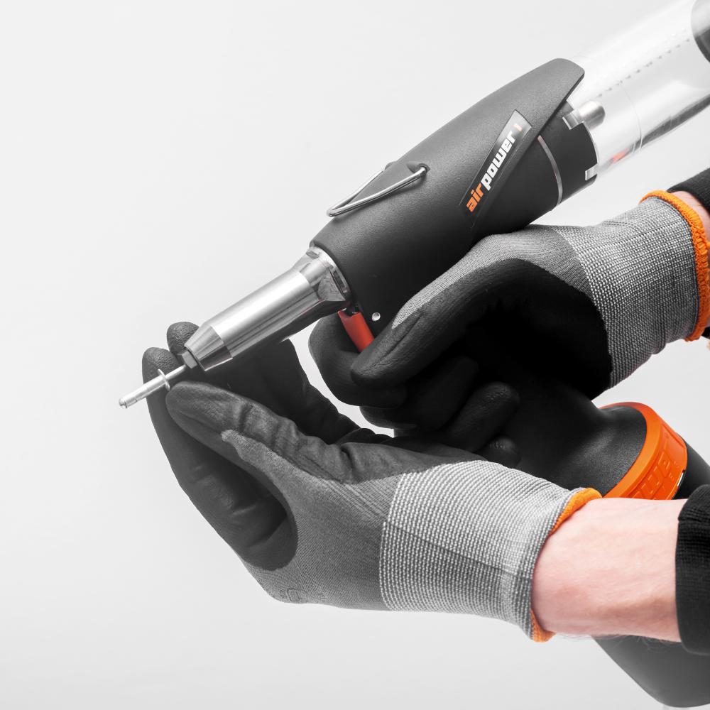 Rozsah dodávky: Pištoľ na slepé nity AIRPOWER 1 , 3 náustky Ø 3–3,2; 4; 4,8–5 mm, 3-dielne upínacie čeľuste, zberná nádoba, náradie SW 12.