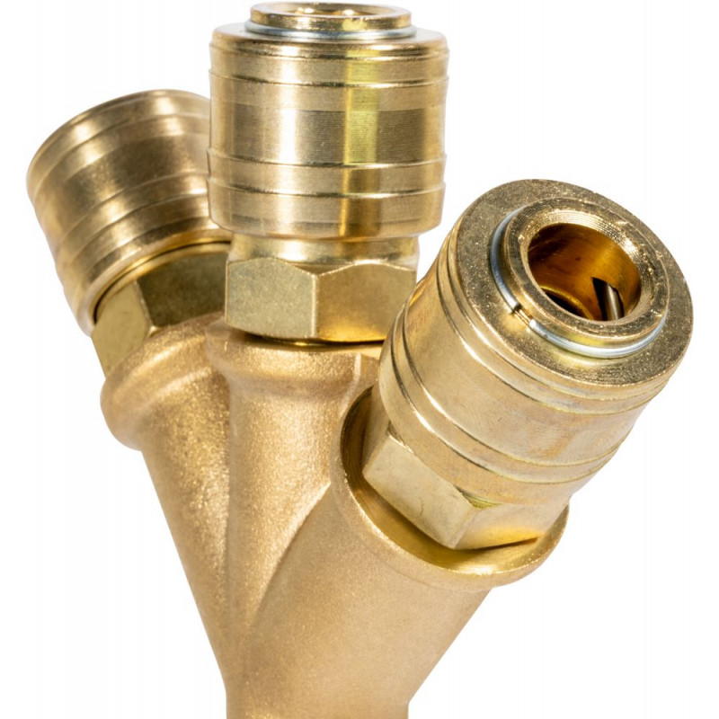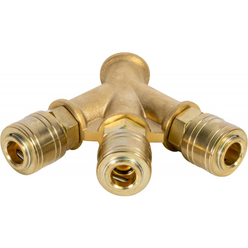 Mosadzný rozdeľovač s tromi spojkami. V balení 1 ks.