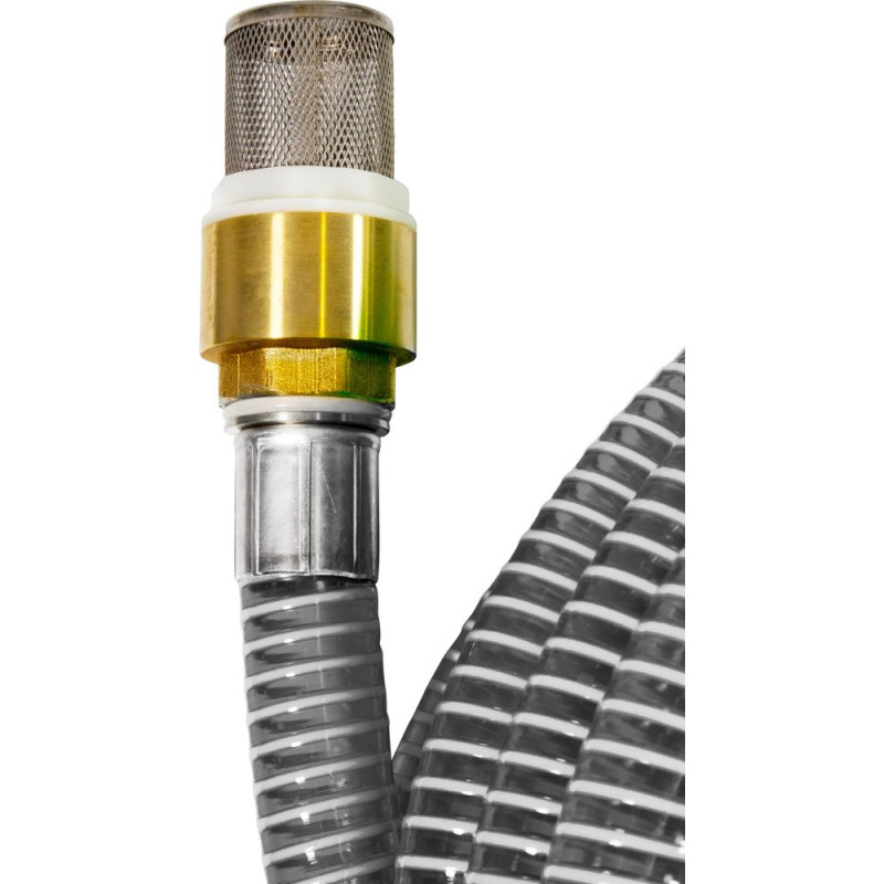 Špirálová sacia garnitúra s mosadznými armatúrami, mosadzným spätným ventilom so sacím košom z ušľachtilej ocele, zalisované koncovky. S prípojkou Vario pre vonkajší a vnútorný závit.