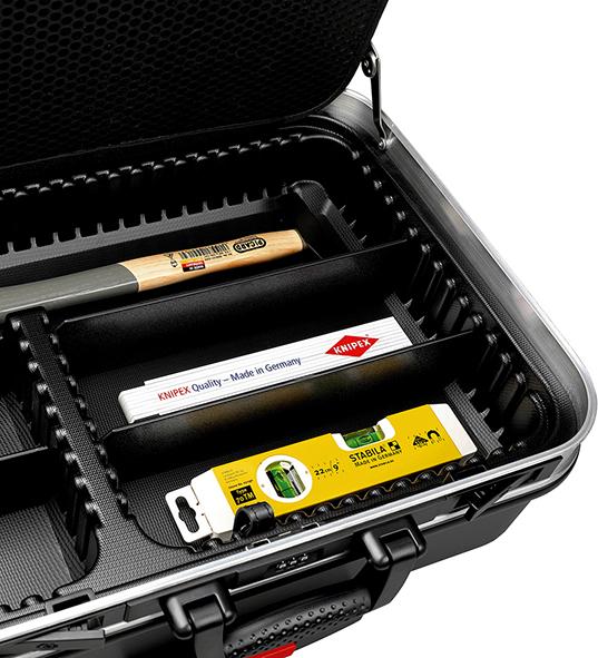 Vyhotovenie: Z odolného plastu ABS, s doskami na náradie a krycími doskami. Dve vyberateľné dosky na náradie s 31 taškami na náradie. Kufrík s individuálne deliteľnými vložkami v 70 mm hlbokej spodnej priehradke a jej krytom so 14 veľkými vreckami na náradie. Stabilné zaisťovacie závesy s kovovými sklápacími zámkami a trojmiestnym číslicovým zámkom na bezpečné zatvorenie veka.