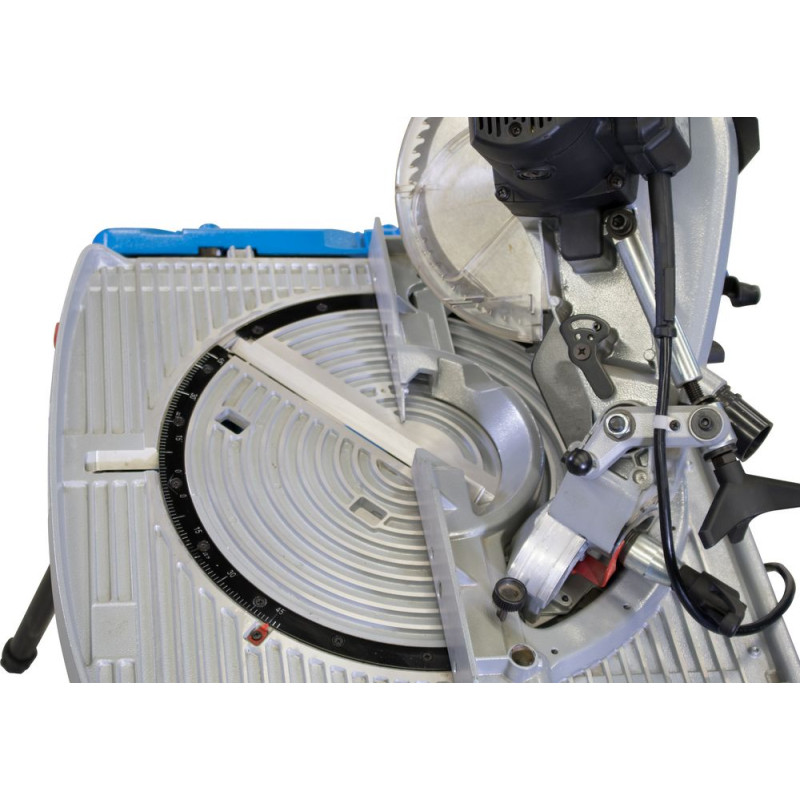 Stolová píla s jednoduchou zmenou na pokosovú pílu pretočením stola do protiľahlej polohy, plynule otočná o 180° pomocou upínacej páky. Otočný stôl vyrobený z tlakovo liateho hliníka, paralelný a úkosový doraz, pripojenie pre odsávací systém, ochranný kryt pílového kotúča. Zberné vrecko na prach, sklopné nohy pre jednoduchú prepravu, pílový kotúč HM.
