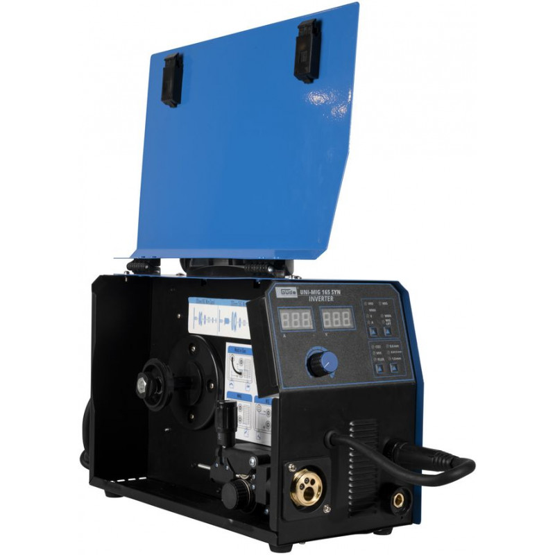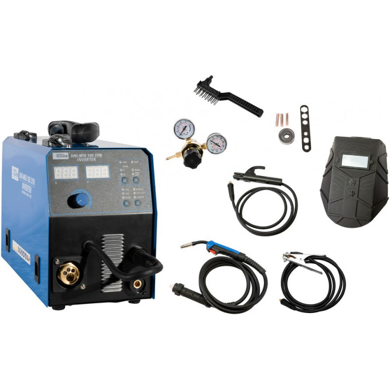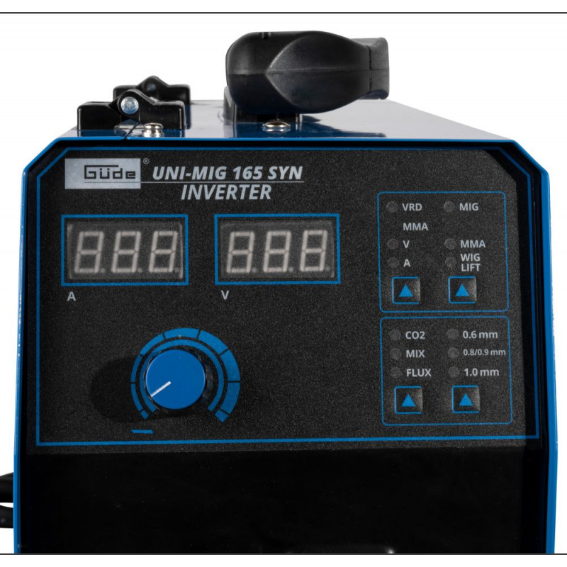 Invertorová zváračka Uni-Mig 165 SYN patrí medzi univerzálne invertorové zváračky v produktovom rade spoločnosti Güde. So zváračkou Uni-Mig 165 SYN sú možné prakticky všetky štyri zváracie procesy: MIG-MAG, MMA (zváranie elektródou), Flux (zváranie plneným drôtom), aj zváranie WIG (voliteľné). Osvedčené doplnkové vlastnosti ako Anti-Stick (zabraňuje prilepeniu elektródy k obrobku), Hot Start (pre optimálne zapaľovanie elektródy) a Arc Force (stabilizuje oblúk automatickým nastavením zváracieho prúdu a zaisťuje tak dokonalé výsledky zvárania) zaisťujú maximálny komfort pri zváraní, a to aj v náročných podmienkach. Nový, inovatívny synergicky regulovaný posuv drôtu sa po výbere procesu zvárania, hrúbky drôtu a sily zvárania automaticky nastaví na správnu rýchlosť. Tieto doplnkové funkcie umožňujú najmä začiatočníkom a neskúseným zváračom okamžite dosiahnuť dobré výsledky zvárania. Držiak elektród a ukostrovacia svorka, ako aj kladivo s kefou pre procesy MMA sú súčasťou štandardnej výbavy. To isté platí aj pre horák MIG/MAG a regulátor tlaku na ochranný plyn. Vhodná na malé cievky a plastové cievky D200 (5 kg). Kryt vyrobený z oceľového plechu s povrchovou úpravou práškovaním, tepelná ochrana proti preťaženiu. Trojmetrový hadicový zväzok s Euro prípojkou (MB15), 1,2-metrový uzemňovací kábel s ukostrovacou svorkou, 1,8-metrový držiak elektród. Prúdová tryska (0,8 mm), 1 plynová tryska. Dvojhodinový reduktor tlaku, plynová hadica. Vrátane zváračského štítu a kladiva na trosku s kefkou. Doba zapnutia pri maximálnom zváracom prúde 230 V (MMA/MIG/MAG/WIG): 30%.
