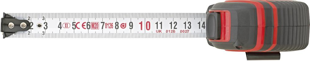 Vyhotovenie: Zo zakrivenej a kalenej pružinovej ocele s duplexnou stupnicou v mm, v plastovom puzdre ABS, ktoré sa vyznačuje vysokou odolnosťou proti nárazom. Povrchová úprava pásma priehľadným lakom kvôli ochrane proti opotrebovaniu. Automatické zvinutie pásma pomocou tlačidla Stop, pohyblivé kovanie na začiatku pásma, na meranie vnútorných a vonkajších rozmerov.